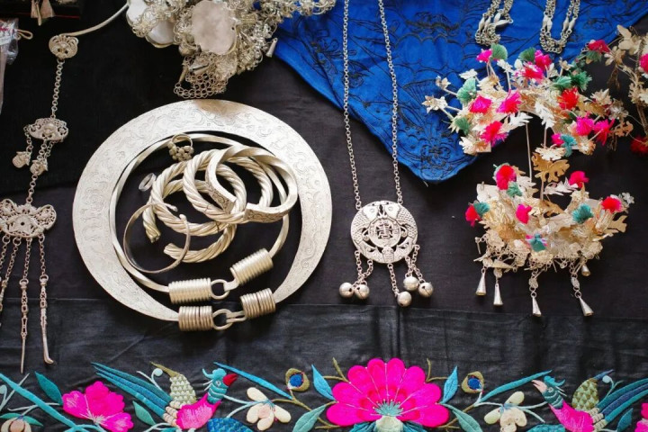 这里有好多手工刺绣的苗服、小包,还有许多苗族银饰。