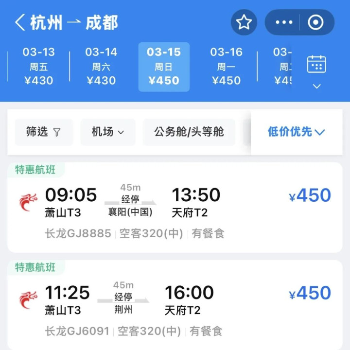 杭州三月飞成都机票价钱