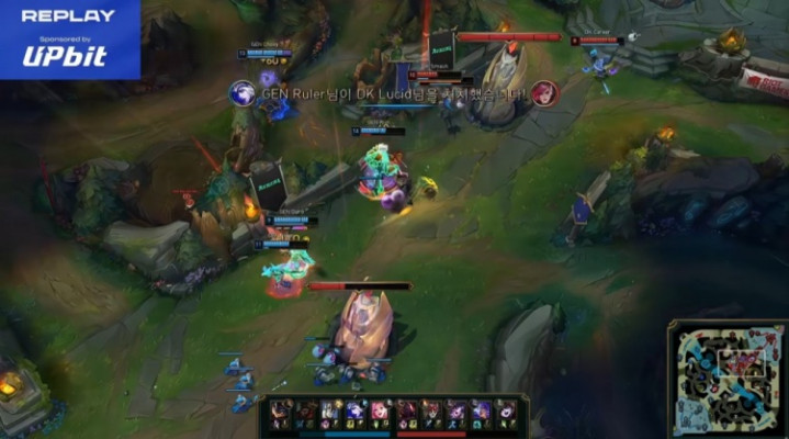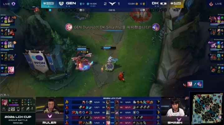 [8:01]下路4v4混战,ruler艾希被Lucid蔚锁头先送一血,随后Canyon山公驾到与Duro萨勒芬妮追击带走Smash芸阿娜,GEN打出1换3,经济跨越1.5k。